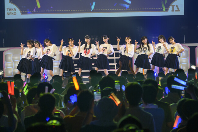 そしてライブ終盤の定番曲「ファンサ」ではメンバーが思い思いにカラーボールを客席に投げ込み、さらには巨大なバルーンボールも客席に登場。お祭り気分をメンバーとファンで一体になって楽しんだところで告知映像が始まり、この1周年記念ライブの追加大阪公演の開催(11月19日梅田TRADにて)、TEAM SHACHI・FRUITS ZIPPERを迎えての『たかねこフェス Vol.2 ~ウインターセッション2023~』(12月8日新宿BLAZEにて)の開催とファンクラブ先行抽選の開始が決定。しかしこれだけでは終わらず、2023年冬のメジャーデビュー決定という嬉しいニュースがスクリーンに映し出された。メジャーデビューとファンの大歓声にステージ上のメンバーも驚きと喜びでいっぱいになりながらも嬉しさをかみしめていた。