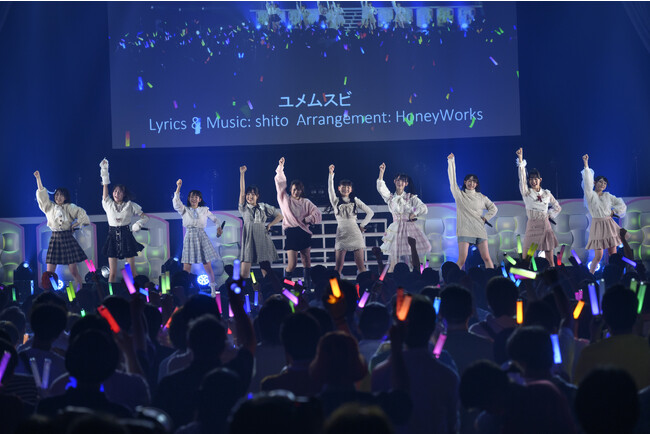 最初のMCではメンバーが1人ずつ、それぞれが考えたアイドルらしいしぐさでファンにアピールし、私服風の衣装で「ユメムスビ」「可愛くてごめん」を披露する。「ユメムスビ」では客席内にもメンバーが登場してステッカーをファンに配り、HoneyWorksの原曲をカバーし「高嶺のなでしこ」のグループ名をSNSでバズらせた代表曲「可愛くてごめん」のキュートなパフォーマンスで大いに沸いた。