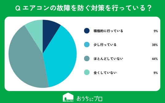 - エアコンの突然の故障に不安を感じる人は90%いるが、エアコンの故障を防ぐ対策を何も行っていない人が53%にも上る。
