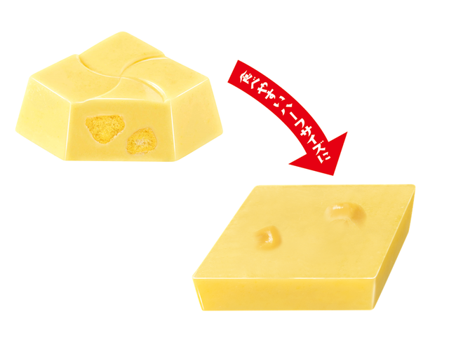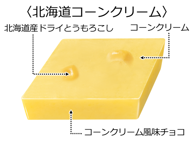 なめらかなコーンクリーム味のチョコの中に、サクサク食感のドライとうもろこし入り。