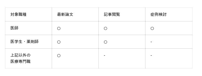 「ClinPeer」の現機能についての、職種ごとの利用可能範囲は下記の通りです。「症例検討」機能については、クリニカルクエッションに基づいた専門医同士の治療選択の討議の場としており、引き続き本人確認が完了した医師の方のみへの提供とさせていただきます。