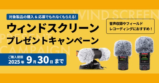 キャンペーン期間中に、『Portacapture X8』、『Portacapture X6』および『DR-70D』のいずれかをご購入後、特設サイトよりご応募いただいたお客様全員に、各製品に対応した防風効果の高いファーを採用しウィンドノイズを低減するウィンドスクリーンをプレゼントいたします。