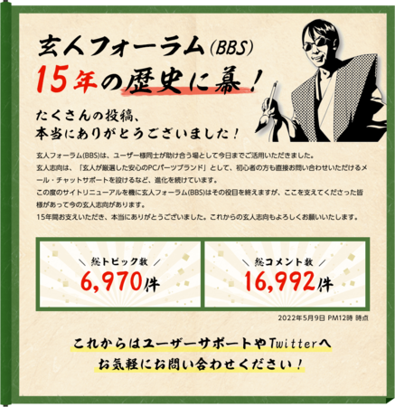 玄人志向は本年の初夏頃に向けたサイトリニューアルを予定しており、この度のサイトリニューアルを機に玄人フォーラム(BBS)を終了させていただきます。
