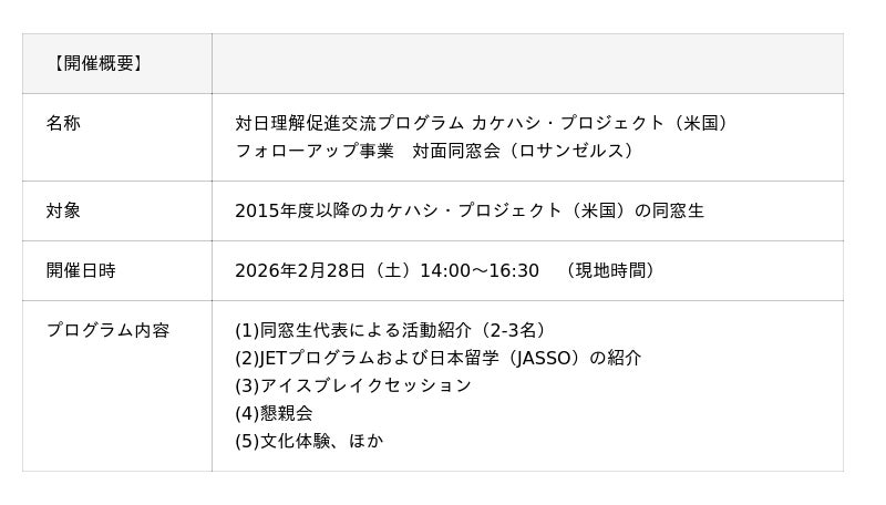なお、本プログラムは、外務省が推進する国際交流事業「対日理解促進交流プログラム(カケハシ・プロジェクト(米国))」の一環として実施されるフォローアップ事業です。