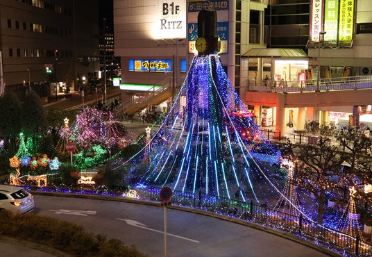 JR高槻駅南側ロータリーに、毎年恒例のイルミネーションが登場。富士山、桜、「将棋のまち高槻」をイメージした将棋駒などのデザインのイルミネーションが装飾されていて、色とりどりの光が冬の高槻を彩っています。