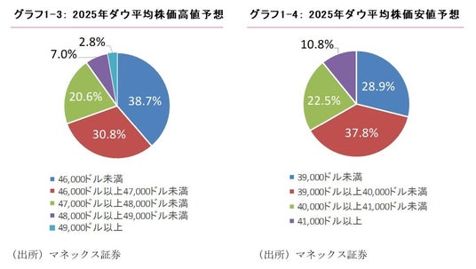 (1-2)2025年のダウ平均株価の高値予想は「46,000ドル未満」が最多、安値予想は「39,000ドル以上40,000ドル未満」が最多
