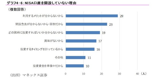 NISA口座を開設していない理由としては「利用するメリットが分からないから」という回答が最多となりました。