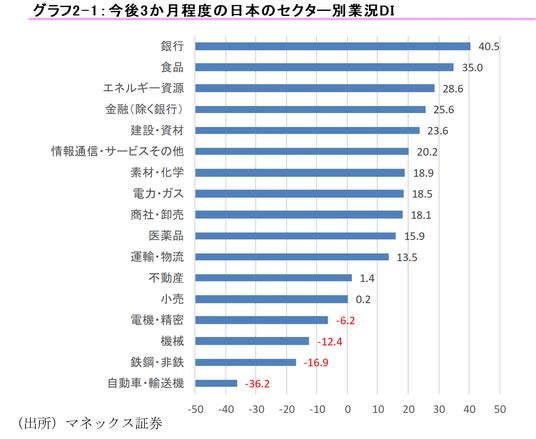 (2-1)日本のセクター別業況DIは「銀行」が最高、「自動車・輸送機」が最低