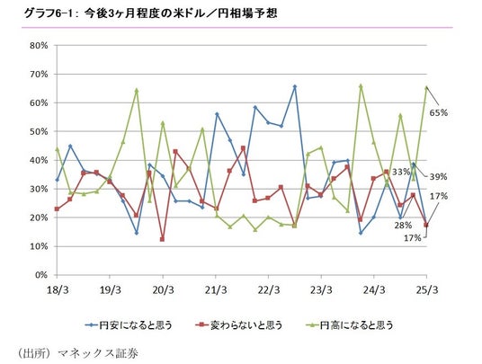 【円高になると思う】(2024年12月)33% →(2025年3月)65%(前回比+32%)