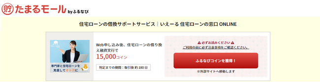 株式会社アイモバイル(本社:東京都渋谷区、代表取締役社長:野口哲也、東証プライム市場)が運営する「たまるモール by ふるなび」( https://furunavi.jp/tamaru/ 以下、たまるモール)は、iYell株式会社が運営する「住宅ローンの借換サポートサービス|いえーる 住宅ローンの窓口 ONLINE」の掲載を開始しました。