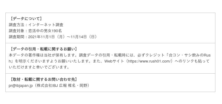 株式会社IBJ(代表取締役社長:石坂 茂、東証一部:6071)が運営する合コン・サシ飲みセッティングサービスのRush(https://bit.ly/3ntqIDe)は、恋活中の男女190人に『クリスマスの過ごし方』についてアンケート調査を実施しました。
