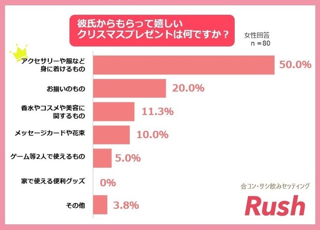 続いて、恋人からもらって嬉しいクリスマスプレゼントをうかがうと、男性は「メッセージカードや手料理など」が3割と最多となり、女性は「アクセサリーや服などの身に着けるもの」が半数を占めています。最多・最少が顕著にあらわれた女性に対して、男性は回答が分散しました。男性へのプレゼントで迷った際、想いのこもった手作りプレゼントを贈ると喜ばれるかもしれません。