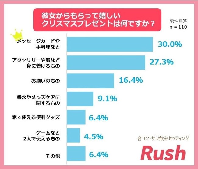 恋人からもらって嬉しいクリスマスプレゼントについて、男性の3割が「メッセージカードや手料理など」と回答。女性は「アクセサリーや服などの身に着けるもの」が半数を占めた。
