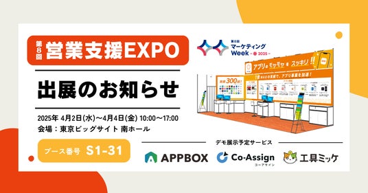 アプリビジネスプラットフォーム「APPBOX」と人材配置の最適化プラットフォーム「Co-Assign」、工具管理DX「工具ミッケ」のデモ体験を提供