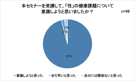 「いつ頃から自身の性の健康状態に気を遣うようになりましたか?」という男性への事前質問の結果、36%が「気を遣ったことがない」と回答しましたが、セミナー後には96%の人が性の健康について意識しようと思ったと回答し、性に対する健康意識が向上したことが分かりました。