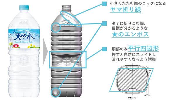 お客様にご支持いただいている、持ちやすく、注ぎやすい形状や、容器として積載・搬送に耐えうる強度を維持したまま、持ち手となる胴部を、平行四辺形にすることで自然とななめにつぶれやすい形状にしました。また、つぶした後「折りたたむ時の目印」として、ボトルの肩と底の部分に星型のエンボスをいれ、たたみやすさを向上。さらに、ボトル肩にヤマ折り線を付けることで、たたんだ際に小さくロック(固定)できる形状となっています。