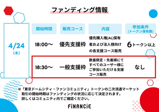 FiNANCiEアプリ内の東京ドームシティ・ファンコミュニティにて、4月24日(木)18時より順次支援コースを販売予定です。
