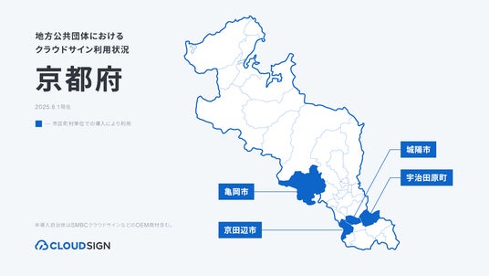 弁護士ドットコム株式会社(東京都港区、代表取締役社長 兼 CEO・弁護士:元榮 太一郎、以下当社)が提供する契約マネジメントプラットフォーム「クラウドサイン」は、京都府内において、亀岡市、城陽市、京田辺市、宇治田原町の4自治体で導入・支援を行ったことをお知らせします。