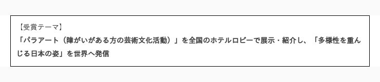 ホテルの公共性を活かして、障がいのある方の芸術性に光を当てるとともに、「地元作家の発掘」という新たな地域貢献の道筋を示したことなどが評価されました。