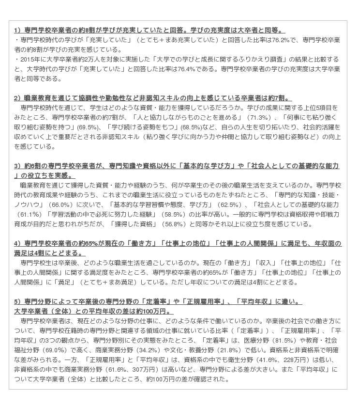 専門学校生は、専門的な知識・技能や資格取得以外に、職業教育を通じて基本的な学び方や社会人としての基礎的な能力を獲得したり、自己の適性や将来への関心を深めており、卒業後の社会・職業生活を通じてその学びの成果を実感していた。こうした「青年期教育」としての職業教育の意義も再評価した上で、これからの高等教育における職業教育の在り方を検討していくことが求められる。そして実社会と多くの接点をもつ職業教育ならではの学生の社会的・職業的自立の支援のあり方は、近年、主体的な学習者の育成に問題を抱えている大学教育に対しても示唆を与えるものではないか。