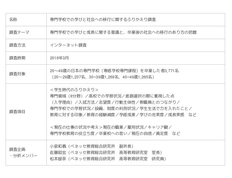 株式会社ベネッセホールディングス(本社:岡山市、以下ベネッセ)の社内シンクタンク「ベネッセ教育総合研究所」では、2016年3月、全国の「専門学校」(専修学校専門課程)を卒業した学歴を持つ20代から40代の社会人3,771名を対象に、専門学校での学びと社会への移行に関するふりかえり調査を実施しました。