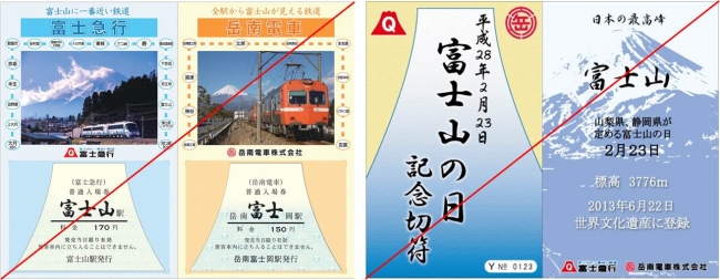 富士急行株式会社(山梨県富士吉田市)と、岳南電車株式会社(静岡県富士市)は、“富士山(ふ・じ・さん)の日”である平成28年2月23日(火)より、初のコラボレーション企画となる「富士山の日記念切符」を部数限定で発売いたします。