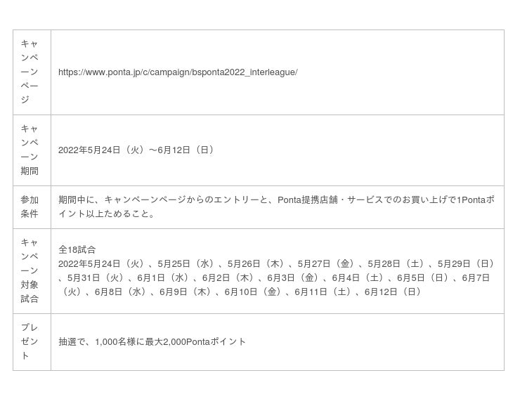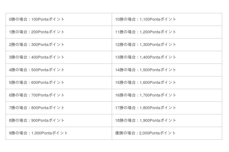 ※交流戦で優勝した場合は、上記勝ち数関係なく2,000Pontaポイントをプレゼントします