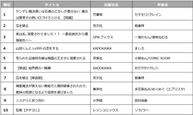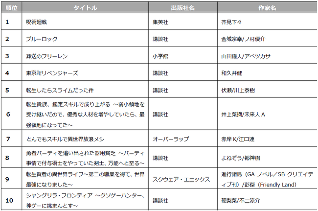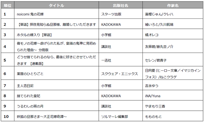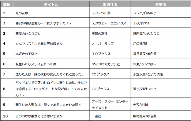 中でも次に来るヒット作品をみんなで選ぶ「電子コミック大賞」で大賞を受賞した和風あやかしシンデレラストーリー「noicomi鬼の花嫁」や、大人気モンスター転生ファンタジー「転生したらスライムだった件」が2部門でランクインするなど根強い人気を見せました。