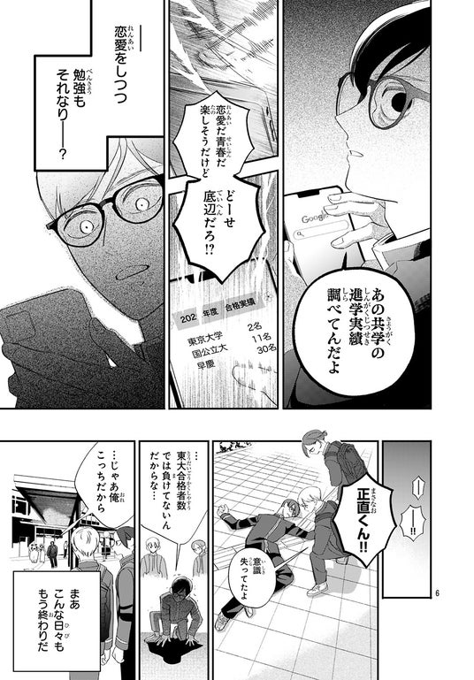 あらすじ:名門男子校生が贈る青くて痛い学歴ラブコメ! 日本トップクラスの中高一貫男子校・開帝高校に通う正直(まさなお)、シグマ、樹太郎(じゅたろう)の3人は、今日も近所の共学カップルに心をかき乱される! 偏差値は高くても、東大合格者数は多くても、彼らの高校生活には何かが欠けている…!? 青春と恋を探して奮闘する、学歴×ラブの男子校コメディ。
