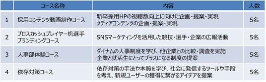 当企画は就職に意欲的な学生を支援することを目的に2016年より継続開催しており、今年で10年目の取り組みです。本年度は、会社の課題に対して若者視点で効果的な解決策を考え実行することをテーマに「採用動画制作」「スカッシュ机選手のブランディング」「企業の人事部体験」 「依存対策」の4つのコースを設け、課題解決に取り組んでいただきました。