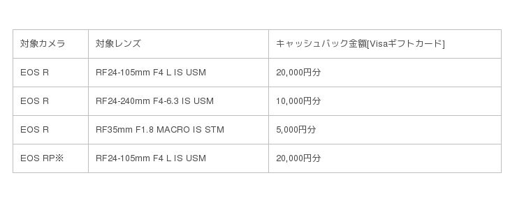 「EOS R」または「EOS RP」に加え、対象のRFレンズを購入し応募した方全員に最大35,000円分をキャッシュバック(Visaギフトカードプレゼント)