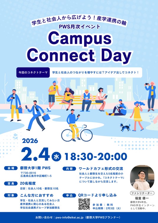 叡啓大学(学長:有信睦弘、広島市中区)は、2026年2月4日(水)、叡啓大学のプロジェクトワークスペースにて、PWS月次イベント【「Campus Connect Day」~学生と社会人から広げよう!産学連携の輪~】を開催します。