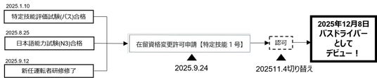 ※日本初:特定技能評価試験(バス)合格第1号、日本バス協会からの新任運転者研修終了証交付第1号を経て、他社において当制度下のデビュー実績が無い(自社調べ)ことから日本初としています。