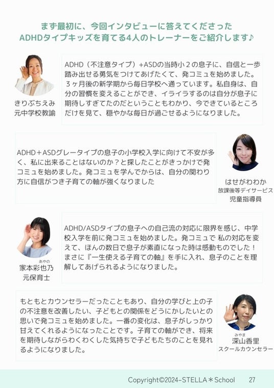 株式会社パステルコミュニケーション(本社:東京都豊島区、代表取締役吉野加容子)の親子のコミュニケーションをスムーズにして子どもの発達を加速させる「発達科学コミュニケーション」講師・水本しおりが主宰するSTELLA*Schoolより、『ADHDタイプ専用 わが子をトラブルメーカーにしないためのお家時間サポート術』無料配布開始しました。ダウンロードはこちら<https://desc-lab.com/mizumotoshiori/8003/)