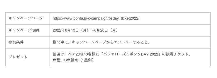 このたびの開催を記念し、2022年6月13日(月)~6月20日(月)の期間中に、キャンペーンページからエントリーされた方の中から抽選で、ペア20組40名様に「バファローズ☆ポンタDAY 2022」観戦チケットをプレゼントします。