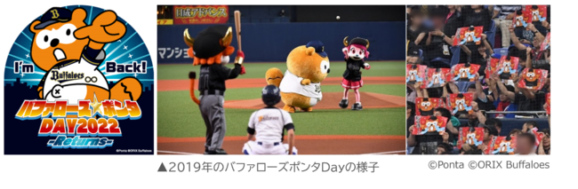 「バファローズ☆ポンタDAY」は、バファローズ☆ポンタが球場のいたるところに登場し、ファンの皆様と一緒にオリックス・バファローズを応援するイベントです。過去4回の開催で、総来場者数は10万人を突破しました。新型コロナウイルス感染症拡大の影響に鑑みてのオンラインライブ配信開催を経て、3年ぶりに京セラドーム大阪で実施します。当日は、バファローズ☆ポンタが球場に駆け付けるほか、応援グッズや特別飲食メニューの販売なども予定しています。