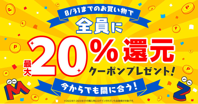 2022年8月1日~2023年8月31日の1年間で1円以上お買い上げいただいたお客様に最大20%還元クーポンをプレゼントいたします!
