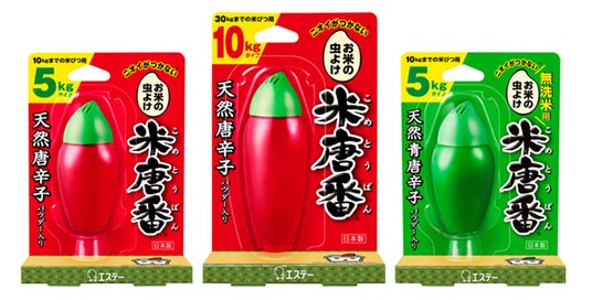 「米唐番」は唐辛子ゼリーが小さくなって交換時期がひと目で分かる、米びつ用防虫剤です。「5kgタイプ」、「10kgタイプ」の他、「無洗米用」をラインナップしています。