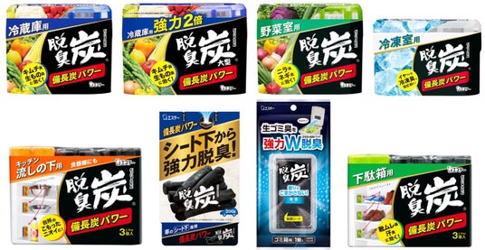 (商品左から)「脱臭炭 冷蔵庫用」、「脱臭炭 冷蔵庫用 大型」、「脱臭炭 野菜室用」、「脱臭炭 冷凍室用」「脱臭炭 キッチン・流しの下用 こわけ 3個入」「脱臭炭 クルマ用 シート下専用 200g」、「脱臭炭 ゴミ箱用」、「脱臭炭 下駄箱用 こわけ 3個入」