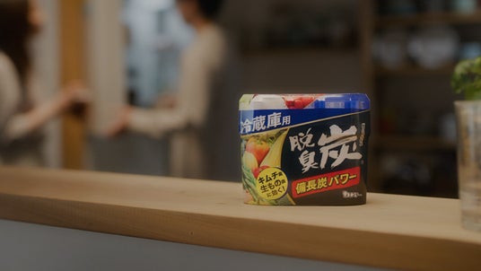 「脱臭炭」は、ゼリー状の炭が減って小さくなることで交換時期がひと目でわかる脱臭剤です。長きにわたり取り組んできた消臭処方技術を活かし、2種類の炭(備長炭+活性炭)を配合したゼリーで、キムチやニンニク、生ものなど、冷蔵庫内のイヤなニオイをしっかり脱臭します。