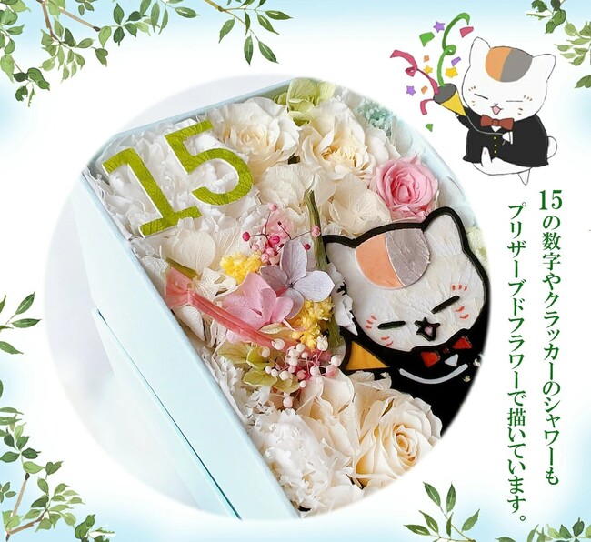 タキシード姿でクラッカーを鳴らし、みんなと一緒にアニメ15周年をお祝いするニャンコ先生をお花で描いた、特別なデザインのフラワーBOX。12月31日までの期間限定販売です。