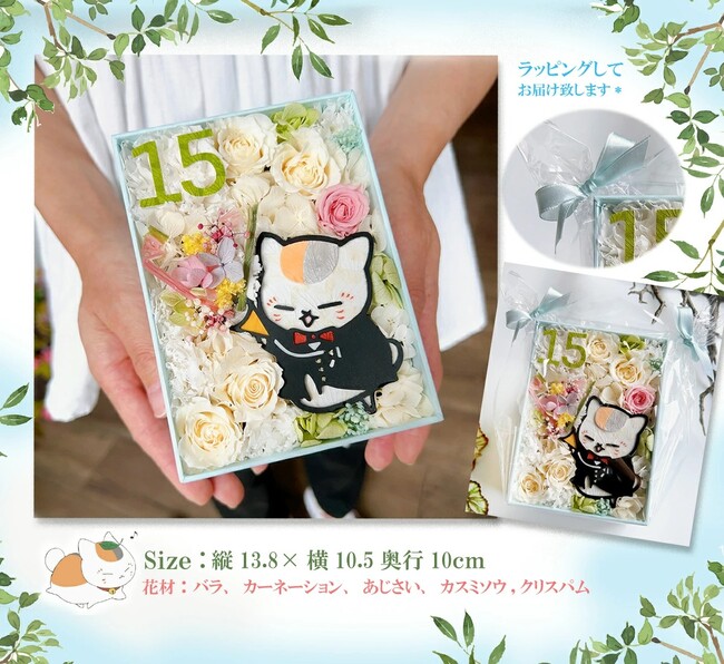 主人公・夏目貴志の用心棒をしながら家の飼い猫として一緒に暮らす人気キャラクター・ニャンコ先生。みんなと一緒に15周年をお祝いするニャンコ先生をお花で描いた、見ているだけでも楽しい気分になれるフラワーBOXは、テーブルや棚に飾っておくだけで元気づけてくれたり、いつでも用心棒をしてくれそう。
