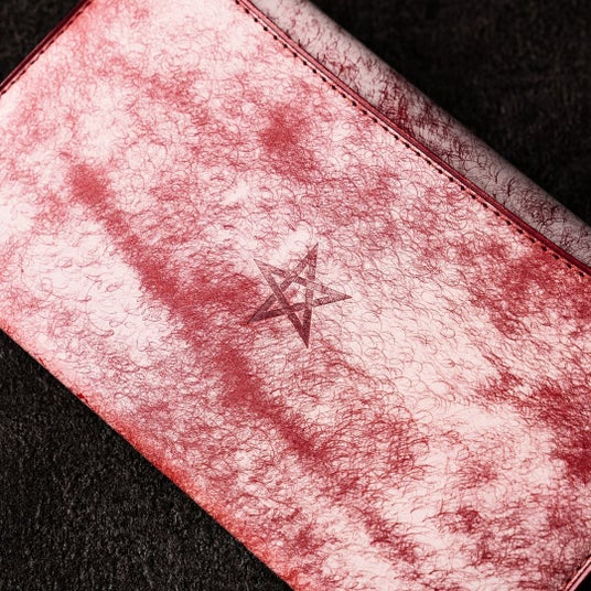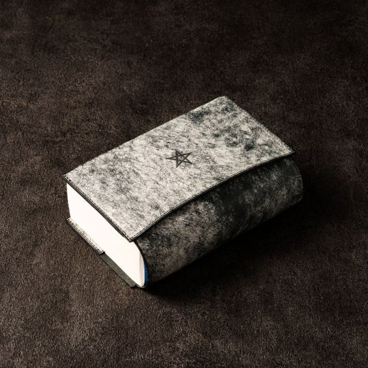 本革ブックカバーには、『晴明桔梗』の刻印と、『御祓済』の刻印を施しています。素材の本革には2種類のイタリアンレザーを用いて京極氏が描く作品の世界を表現しています。