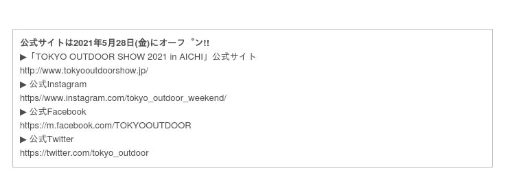 2021年9月25日(土)・26日(日)に愛知県の「Aichi Sky expo」にて、「自然に優 しく、自然を楽しむ。新しく豊かな生活を、簡単に誰にでも。」 をコンセプトに 「TOKYO OUTDOOR SHOW 2021 in AICHI」を開催することが決定しました。