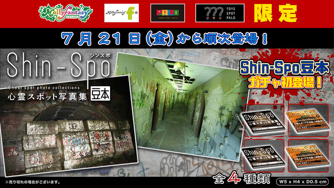 株式会社イオンファンタジー(本社:千葉県千葉市、代表取締役社長:藤原徳也、以下、当社)は、東京キララ社の写真集「シンスポ 心霊スポット写真集(監修:コヘイ)」「シンスポ 心霊スポット写真集・廃墟編(監修:栗原 亨)」を手のひらサイズの豆本にした「Sin-Spo豆本」を、アミューズメント施設「モーリーファンタジー」「PALO」、カプセルトイ専門店「TOYS SPOT PALO」などに設置する当社オリジナル完全キャッシュレスカプセルトイマシン「かぷえぼ」限定のカプセルトイとして7月21日(金)より順次展開いたします。