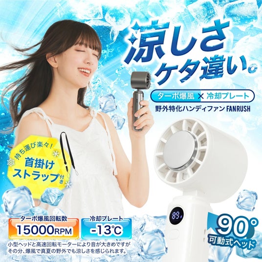 「FanRush(ファンラッシュ)」は、ターボ爆風と-13℃のペルチェ冷却プレートを搭載した"野外特化"のハンディファンです。