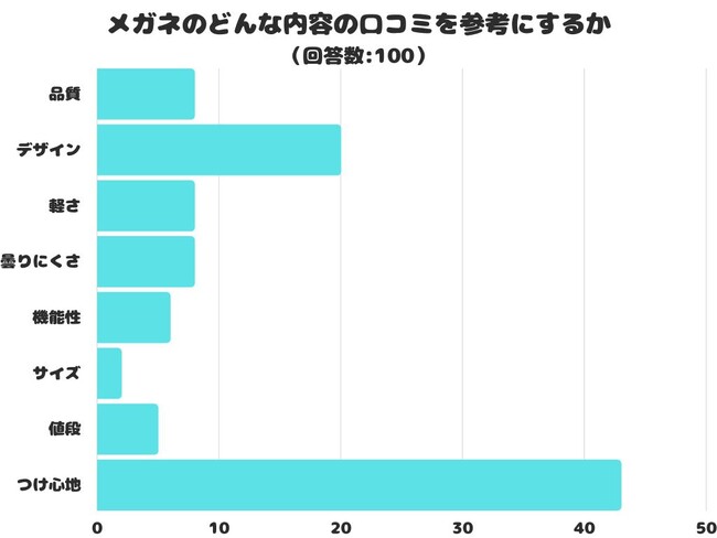 メガネのどんな内容の口コミを参考にするかをアンケートにて調査したところ、1位は「つけ心地」でした。