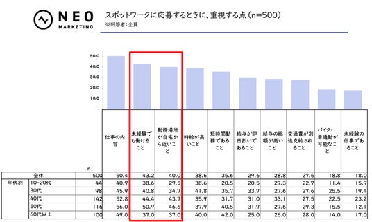 注目すべきは、そこに続いた「未経験でも働けること」「勤務場所が自宅から近いこと」の割合。