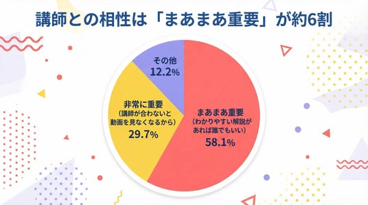 「非常に重要(講師が合わないと動画を見なくなるから)」という回答も29.7%あり、合計で87.8%の人が講師との相性を重視していることがわかりました。