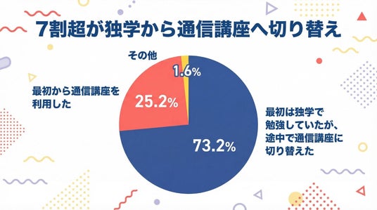 学習の開始方法について尋ねたところ、「最初は独学で勉強していたが、途中で通信講座に切り替えた」が73.2%にのぼりました。